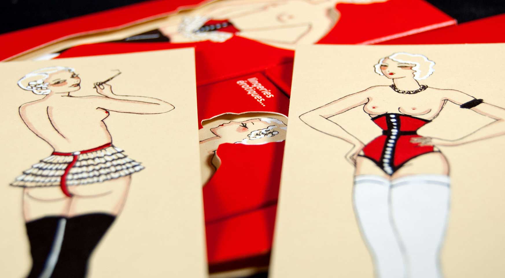Eine Modeheft mit handkolorierten Drucken von 1937 war die Vorlage für dieses Zeichenbuch. Am Anfang sind einige Arbeitsschritte der Grafikerin: Titel und Schutzumschlag neu erstellen, Grafiken restaurieren und aus handkolorierten Elementen Vorlagen für die Prägestempel erzeugen.